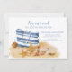 Faire-part de plage moderne avec un sac de plage rayé bleu et blanc sur le sable avec de beaux coquillages de mer.
