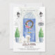 Annoncez votre nouvelle adresse grâce à notre faire-part élégante avec une porte Bichon Frise, une porte bleue, un tapis de bienvenue, une ardoise, des topiaires et une couronne fleurie posée sur un arrière - plan en brique grise.