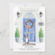 Annoncez votre nouvelle adresse avec notre faire-part élégante avec un Boston Terrier, porte d'entrée bleue, tapis de bienvenue, ardoise, topiaires et une couronne fleurie sur un arrière - plan en brique grise.