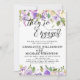 De beaux roses ultraviolets se mêlent à des fleurs blanches crémeuses pour créer un beau design floral. Ils sont engagés est écrit dans un grand script courant. Le reste du texte est une police serif classique. L'arrière de l'invitation est aussi joli que l'avant. C'est un violet royal riche avec de minuscules points blancs. Le design floral de l'avant se poursuit à l'arrière. Le texte est facile à customiser.