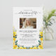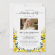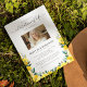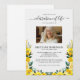 Élégant faire-part de funérailles de célébration de vie avec une photo de la personne qui est commémorée, des fleurs aquatiques jaunes de jardin rustique et un modèle de service commémoratif moderne facile à personnaliser.