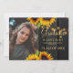 Carte florale élégante de faire-part de graduation avec bouquets de tournesols, cordes de lumières scintillantes et un script de typographie chic en faux or sur un arrière - plan de bois brun foncé de grange.++++++++ Facile à personnaliser avec votre nom, l'école et la classe.