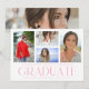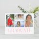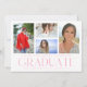 Simple Script Multi Photo Graduation Card présente quatre de vos photos préférées de votre diplômé de l'université ou du lycée sur le devant avec l'élégante couche de calligraphie rose moderne "Graduate". Ajoutez une photo supplémentaire au verso. Simple, élégant et classe. Créé par ©Evco Studio www.zazzle.com/store/evcostudio