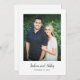 Un faire-part de mariage magnifiquement conçu avec une grande photo sur le devant et une bordure blanche élégante en encart. L'intérieur présente une typographie traditionnelle accentuée et encadrée de bordures de feuilles vertes.