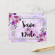 Cartes postales de faire-part de mariage avec fleurs violettes, cadre à paillettes argentées et confettis, et police de caractères à pinceau tendance ! ~ Découvrez toute la gamme de mariage pour ce design dans ma boutique !
