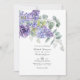 Faire-part de mariage tendance avec feuilles d'eucalyptus et plantes succulentes mélangées à des fleurs aux accents de lilas pastel, violet et violet. Idéal pour tout thème ou mariage champêtre. Le code QR au verso renvoie à votre site de mariage où les gens peuvent en savoir plus et répondre.