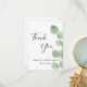 Une carte de remerciement pour un mariage. Un fond blanc chic décoré de feuillage d'eucalyptus. Sur le devant, un grand texte manuscrit noir et le texte : Merci, votre et une date.