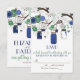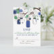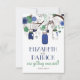 Illustrations fantaisistes de pots Mason bleus foncés suspendus à un arbre avec des ficelles en forme de cœur, deux tourtereaux et une variété de fleurs bleues et vertes. Ce faire-part de mariage est assorti à d'autres articles. Cette invitation avec pot Mason serait parfaite pour des mariages de printemps, d'hiver et en plein air.