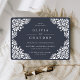 Élégantes invitations de mariage vintage dans une riche couleur bleu minuit avec une bordure déco ornée qui évoque l'aspect de papier découpé dans le style papel picado.