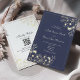 Élégant et intemporel, ce faire-part de mariage bleu marine vintage présente des fleurs dorées bohème chic or pour une touche de luxe. Avec un code QR pratique pour les RSVP en ligne et un accès facile à votre site Web mariage pour plus de détails, c'est le mélange parfait de sophistication classique et de commodité moderne.