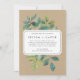 faire-part de mariage botanique vintage affiche vos détails mariages dans du lettrage noir foncé moderne, sur un arrière - plan de feuilles d'aquarelle vert peint, branches et fougères. Arrière - plan kraft tressé ajoute un charme rustique.