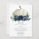 Ce design est composé d'un citrouille blanc rustique niché dans un bouquet de fleurs marines peintes en aquarelle et d'une végétation luxuriante. Les polices classiques élégantes cravate ce design ensemble. Voir la collection entière pour plus d'articles correspondants !