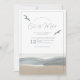 Invitations invités à votre fête balnéaire avec ce faire-part de mariage, avec une scène de plage illustrée ornée de deux gracieux mouettes. Le dos présente des rayures nautiques classiques dans des tons gris-bleu apaisants, évoquant la beauté tranquille de l'romantisme côtier.