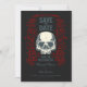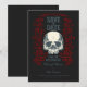 Magnifique carte "save the date" pour un mariage sombre avec une atmosphère sombre. Le design présente un fond gris foncé presque noir, des arabesques victoriennes rouges et un crâne vintage. La typographie de style script en gris-bleu ajoute juste la bonne touche. Joli, mais gothique. Ajoutez vos informations de mariage pour une annonce spéciale qui fera savoir à vos invités votre mariage à venir tout en montrant votre style personnel unique. Découvrez les articles coordonnés dans notre boutique, Enchanted Finch.