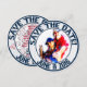 Cartes de sauvegarde de date rondes sur le thème du mariage de baseball. Celle-ci est personnalisée pour un client spécifique. Le côté avant de la carte est un encart/ cadre photo. Anneaux intérieurs et extérieurs bleus avec une photo personnalisée au centre. Des cercles de texte en verre décoratifs bleus autour du haut et lisent : SAUVEGARDEZ LA DATE. Plus de cercles de texte en verre autour du bas et lisent la date de mariage des clients. Ce texte est des deux côtés de la carte. Le fond de la bordure extérieure est à rayures bleues et blanches de baseball. Sur le verso de la carte, vous avez le même texte en haut et en bas sur un fond rayé. De petits embellissements de cœur rouges s'assoient entre les mots. Le fond central est blanc uni avec des balles de baseball dispersées partout. Le texte en verre décoratif lit : Mathew Howard et Sylvia Newcomb montent sur le marbre et parient à 1000 que leur amour durera toujours. Les équipes se fondront en une seule le 11 juin 2016. Les invitations de mariage sur