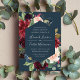 Notre faire-part de mariage Radiant Bloom entoure vos détails de mariage avec un cadre géométrique de fleurs d'aquarelle peintes en marsala bordeaux, rose rousse et bleu marine, avec feuillage botanique vert et feuilles d'eucalyptus sur un riche arrière - plan bleu marine. Un beau choix de couleurs luxuriantes et saturées pour les mariages d'automne ou d'hiver.