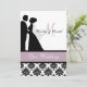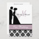 Copie noire et blanche de damassé avec une bande de lavande, des jeunes mariés de silhouette, et secteurs que vous pouvez personnaliser avec vos noms, initiale de monogramme, cérémonie de mariage et information de réception sur un faire-part de mariage customisé qui est chique et traditionnelle tous dans un !