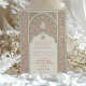 Ce faire-part de mariage est un délicat équilibre de rose et de vert sauge, inspiré par les motifs complexes de la dentelle islamique. Fêtant un mélange d'art traditionnel et de design moderne, l'invitation est faite par un arrière - plan vert sage aux motifs de dentelle florale et géométrique qui rappellent les détails ornés de l'architecture islamique. L'arche architecturale sur le devant encadre les détails de l'événement dans un script élégant, dressé contre un arrière - plan crémeux qui complète les tons de rougeur. L'arrière de l'invitation reflète ce design, offrant un cadre harmonieux pour des informations complémentaires sur l'événement ou un message personnalisé à vos invités. Cette invitation est parfaite pour les couples qui recherchent un faire-part gracieux et culturellement riche pour leur journée de mariage.