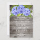 Charmante et tendance, cette invitation présente de magnifiques hydrangées bleues en pleine floraison, ornées de fougères, de verdure et de dentelle blanche sur arrière - plan de bois rustique gris. Parfait pour les mariages de printemps, de jardin ou de plein air.