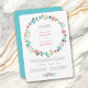 Voici une jolie faire-part de mariage moderne qui a un peu de fantaisie. Il présente une couronne fleurie de style boho aux couleurs rose, bleu et vert. Votre texte personnalisé au centre est en gris mou et correspond au rose rose. Le texte supplémentaire est en gris correspondant sous l'image de la couronne, et le bas de l'invitation a une petite image de bouquet floral correspondant. L'image et le texte sont placés sur un arrière - plan blanc. L'arrière de l'invitation est bleu uni assorti, ajoutant une jolie touche de couleur. Plutôt pour les mariages de printemps, d'été et d'automne.