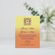Une faire-part de mariage d'inspiration bohème avec un arrière - plan jaune et orange bijou avec du texte violet foncé et un design carré avec du monogramme. L'expression est celle de la mariée et du marié.