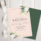 Joli faire-part de mariage rose vif et vert sauge, avec deux bouquets de rose aquarelle en blanc et vert, avec un brin de fausse parties scintillant. Idéal pour un mariage d'hiver.