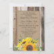 Design rustique de carte de faire-part de mariage occidentale avec bouquet de tournesol sur tissu à l'aspect lin et planches de grange arrière - plan et une gravure de coeur avec monogramme à l'arrière.