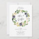D'élégantes invitations à un mariage fleuri sont accompagnées d'une couronne de fleurs d'aquarelle et de petits fruits en bleu indigo et ivoire, entrecoupés de feuillage botanique et de feuilles verdoyants, encerclant vos noms en lettres manuscrites chic. Personnalisez avec vos détails mariages sous.