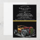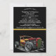 Hot Rod faire-part de mariage incendie a une flamme orange brûle et autour d'une vieille voiture. En bas au milieu et un arrière - plan noir avec un endroit pour mettre tout votre texte invitation. Ce design unique combine un faire-part de mariage formel avec une illustration vibrante de canne chaude. La section supérieure présente des détails sur son nom et son nom célébration mariage le "samedi 18 janvier 20XX" à Vancouver, en Colombie-Britannique. Ci-dessous, une canne chaude puissante et de couleur vive avec moteur exposé et tuyaux d'échappement avance, créant un contraste saisissant de thèmes. tous personnalisables.