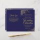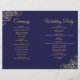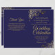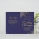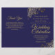 Cette combinaison de faire-part de mariage et de programme présente un élégant design bleu marine et or avec des volutes et des boucles délicates en faux foil dans les coins. Le devant comporte le faire-part, tandis que l'intérieur contient les détails de la cérémonie et du cortège. Le dos comporte un espace pour une note de remerciement.