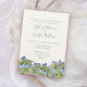 Simples invitations de mariage avec bordure florale bleue de la ligne "Bella Blue". Le papier ecru flt est affiché, avec d'autres options disponibles. La carte a un script bleu et des polices imprimées, avec une large bordure inférieure de bourgeons hydrangéens réalistes. Les fleurs bleues ne font qu'ouvrir avec beaucoup de centres jaunes-verts qui apparaissent. Le libellé de l'exemple commence par "L'honneur de votre présence est demandé", avec des noms en gros caractères en dessous. Tous les renseignements sur la cérémonie et la réception se trouvent sous forme de paragraphe et peuvent contenir une adresse de réception si nécessaire. Ajoutez des espaces entre les lignes au gré de votre choix.