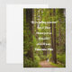 Faire-part de mariage informel rustique en forêt - Texte simple et informel en blanc sur une photo d'un couple de mariés descendant un chemin à travers une forêt d'arbres verts luxuriants de hautes tailles.