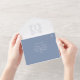 Ce faire-part de mariage comporte des initiales entourées d'un laurier botanique romantique et d'élégantes lettres de script dans une teinte bleue poussiéreuse. Cet article fait partie de notre collection d'invitations Kami K310, veuillez visiter notre magasin pour voir les articles de coordination.