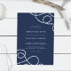 Le design élégant de votre faire-part de mariage côtière comprend vos détails de mariage en lettres blanches sur un arrière - plan bleu marine, accentué aux coins avec des boucles de corde nautique tressée. Les invitations se retournent vers de larges bandes nautiques.