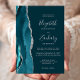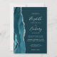 Le bord gauche de cette élégante faire-part de mariage moderne comporte une bordure turquoise en aquarelle ornée d'une parties scintillant en faux argent. Le texte personnalisable combine écriture manuscrite, copperplate et polices italiques en gris argenté sur un arrière - plan bleu turquoise foncé. L'envers présente un design turquoise et argenté assorti.