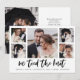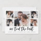 Cette simple annonce de mariage noir et blanc présente une typographie moderne et décontractée qui dit "nous avons noué le nœud", avec une grille multi-photos de cinq photos sur le devant et une autre au dos. Une façon élégante de faire savoir à vos amis et à votre famille que vous avez pris la fuite ou que vous êtes simplement mariés.