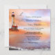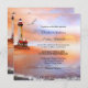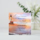 Faire-part de mariage avec un tableau romantique d'un océan, plage et phare avec deux mouettes au coucher du soleil. Parfait pour une plage ou un mariage de destination. Cette invitation a une carte RSVP correspondante.