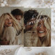 Ce faire-part de mariage magnifiquement conçu comprend vos photos, rehaussé par une calligraphie sophistiquée. La typographie mêle écriture fluide et polices serif classiques, créant une esthétique intemporelle et élégante. Les tons neutres, l'éclairage chaleureux et les textures douces de l'image apportent une touche naturelle et romantique, ce qui rend ce design parfait pour les mariages modernes, minimalistes et rustiques. Avec son habillage élégant de détails mariages, cette invitation donne le ton parfait pour une célébration chaleureuse. La mise en page est entièrement personnalisable, vous permettant de personnaliser le texte pour correspondre à votre journée spéciale. Disponible dans une variété de papiers de haute qualité et de finitions, cette invitation est un choix étonnant pour les couples à la recherche d'un faire-part mariage unique mais classique.