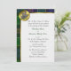 Joli faire-part de mariage écossais en plaid, fait avec un arrière - plan blanc et des lignes d'accent doré, en haut et à gauche de l'invitation. Une médaille d'or dans le coin supérieur gauche, avec des oeuvres de bruyère, dessus. Le plaid coloré du clan Allison arête les côtés gauche et supérieur de l'invitation ainsi que le dos. Les textes en noir et vert sont entièrement personnalisables selon vos besoins.