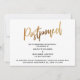 La distinction de cette suite est due à la police de caractères moderne et manuscrite utilisée pour les phrases d'accent. Dans ce morceau, la police de caractères manuscrite a été utilisée pour créer un graphique simple qui indique "Reporté", en grand et en gras. Le graphique a été amélioré par un effet doré lisse pseudo-métallique. Le libellé de mon texte de remplacement est axé sur un mariage qui est reporté, mais si votre événement est annulé, ce design pourrait également répondre à ce besoin. Utilisez les champs de modèle pour ajouter vos informations personnelles et faire de ce design moderne et unique, le vôtre. L'arrière-plan peut être changé en n'importe quelle couleur que vous préférez. N'hésitez pas à nous contacter pour toute demande spéciale ou pour une aide à la personnalisation. // 105 //