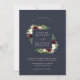 Notre faire-part de mariage Blush Romance encadre vos noms avec une bordure élégante de marsala bordeaux, de fleurs roses et d'ivoire avec un feuillage vert luxuriant. Personnalisez avec vos détails mariages en lettrage blanc chic sur un arrière - plan bleu marine riche.