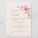 Ce faire-part de mariage au design sobre et romantique est décoré d'un arrière - plan rose pastel et d'aquarelles fleuries dans les tons rose et pêche, accentuées par des feuilles verts dans le coin supérieur droit. Le design est élégant et minimaliste, avec une palette de couleurs chaleureuse et accueillante, lui donnant une esthétique intemporelle et sophistiquée.