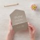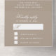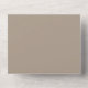Un faire-part de mariage simple mais élégant et inhabituel avec RSVP amovible. Une fois plié, il ressemble à une enveloppe, avec l'adresse de retour imprimée sur le pli, et il peut être envoyé par la poste. Le RSVP détachable a sur son dos l'adresse imprimée et aussi un lieu pour le timbre, de sorte qu'il peut être envoyé par la poste comme carte postale. Certains mots sont écrits dans un élégant script calligraphique : le mot Mariage, les noms de la mariée et du marié et les mots "Kindly response" dans la RSVP. Le reste est écrit en casquette. L'arrière - plan est taupe massif (couleur terre entre brun et gris). Tout le texte est blanc (sauf le M initial).