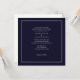 Le faire-part de mariage bleu-foncé simple avec de doubles carrés et écriture grise, cet invitation peut être employé pour n'importe quelle occasion spéciale. Cet invitation est disponible dans le *Note d'ivoire, blanc et bleu-foncé - filigrane de picoseconde du verso, facilement démontable.