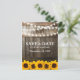Cartes de Faire-Part de Mariage Rustiques avec un fond de grange campagnarde, tonneau de chêne foncé, guirlande lumineuse, tournesols jaunes dorés, votre monogramme et un modèle de faire-part.