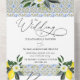 Faire-part thématique citron méditerranéen avec carreaux bleus aquarelle, beaux citrons jaunes et fleurs blanches. Parfait pour un mariage à destination ou un mariage estival élégant en plein air. Faire-part Tout en Un avec carte de réponse RSVP