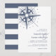 Faire-part de mariage chic côtier avec une illustration de compas dessinée à la main de style vintage en haut à gauche dans un bleu de port délavé, avec vos détails de mariage en bleu marine classique. Parfait pour les mariages sur la plage, en été ou sur le thème nautique, ces faire-part de mariage de style côtier sont imprimés sur des bandes larges bleues et blanches.