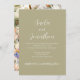Donnez le ton pour une fête de printemps romantique avec ce faire-part de mariage floral vert sauge. L'avant est orné d'une typographie de script moderne sur un arrière - plan vert tendre, tandis que l'arrière présente un bouquet vibrant de fleurs de jardin. Personnalisez avec vos détails mariages pour créer une belle première impression pour vos invités.