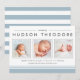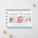Annoncez l'arrivée de votre bébé sucré avec nos annonces de naissance de style collage moderne et neutre, avec trois de vos photos de nouveau-nés préférées au format carré, accentuées de polices de caractères modernes et d'éléments rayés en noir doux et bleu ciel clair. Personnalisez avec le nom de votre bébé, les statistiques de naissance et le message de famille en utilisant les champs fournis.