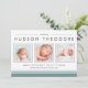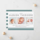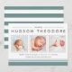 Annoncez l'arrivée de votre bébé sucré avec nos annonces de naissance de style collage moderne et neutre, avec trois de vos photos de nouveau-nés préférées au format carré, accentuées avec des polices de caractères modernes et des éléments rayés en noir et turquoise doux vert. Personnalisez avec le nom de votre bébé, les statistiques de naissance et le message de famille en utilisant les champs fournis.